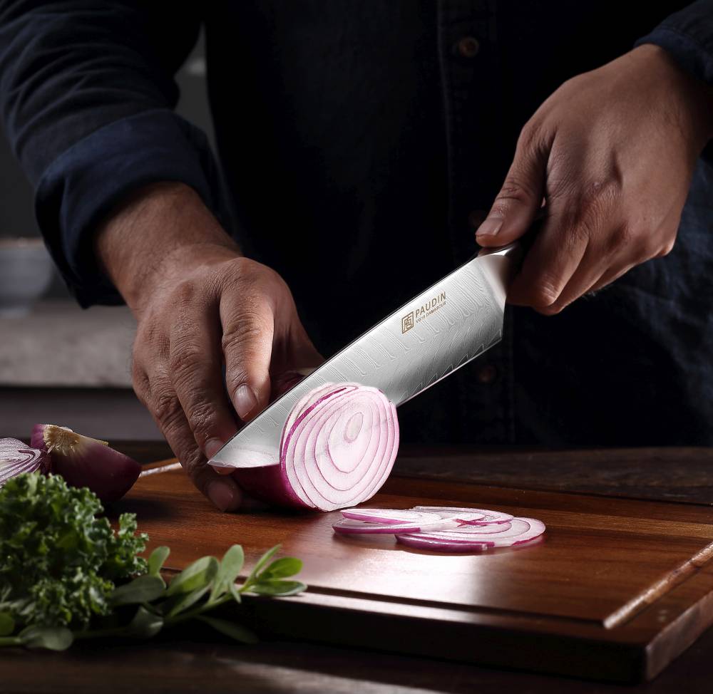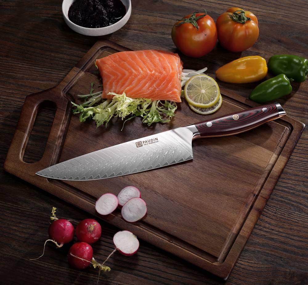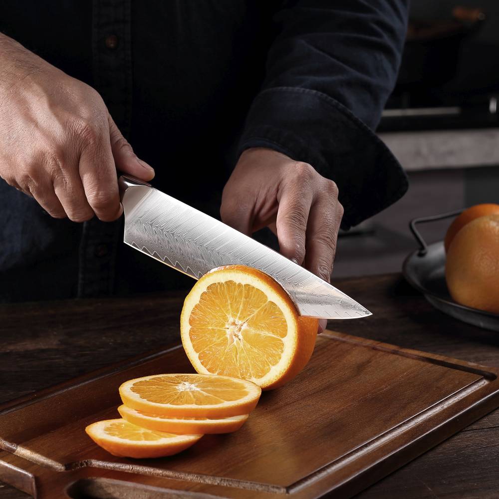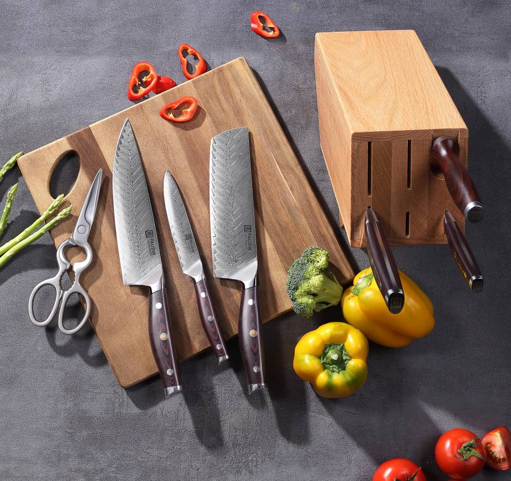Plume Luxe collection is made of Japanese AUS10 Damascus steel blade and contains Vanadium, which improves the wear resistance and ease of sharpening. While high-quality knives are in the 56 to 58 HRC range, this knives has increased hardness to 62 HRC! As a result, Plume Luxe classifies as an exclusive knives with high toughness, high sharpness, and exceptional corrosion resistance.